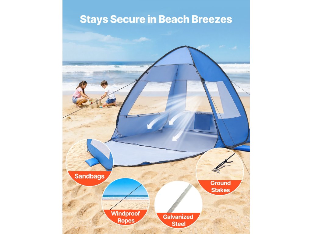 Cortul de plajă are un proces de asamblare simplu și rapid care vă permite să montați și să demontați cortul fără efort, maximizându-vă timpul liber.