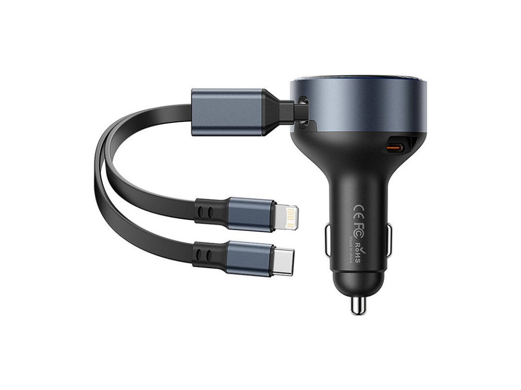 Încărcătorul Vention este o soluție versatilă pentru încărcarea rapidă a trei dispozitive simultan, ideală pentru mașinile cu 12-24 V. Cu cabluri USB-C și Lightning încorporate și un port USB-C suplimentar, acesta oferă o mare versatilitate și elimină mizeria firelor încâlcite.