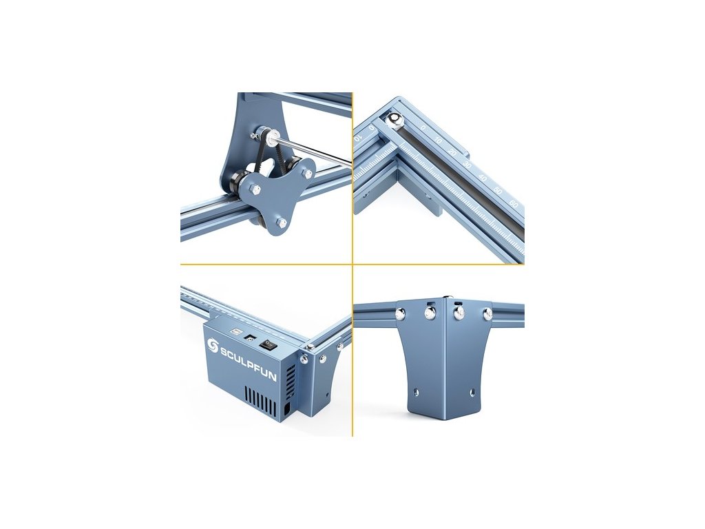 Designul construcției complet metalice face ca gravatorul laser să fie extrem de rezistent și sporește precizia gravării. Asamblarea poate fi finalizată în 10 până la 20 de minute. Cadrul structural este foarte durabil și rămâne deschis pentru actualizări. Îl puteți înlocui cu alte lasere noi. Sau înlocuiți grinzile metalice mai lungi pentru a extinde zona de gravură.