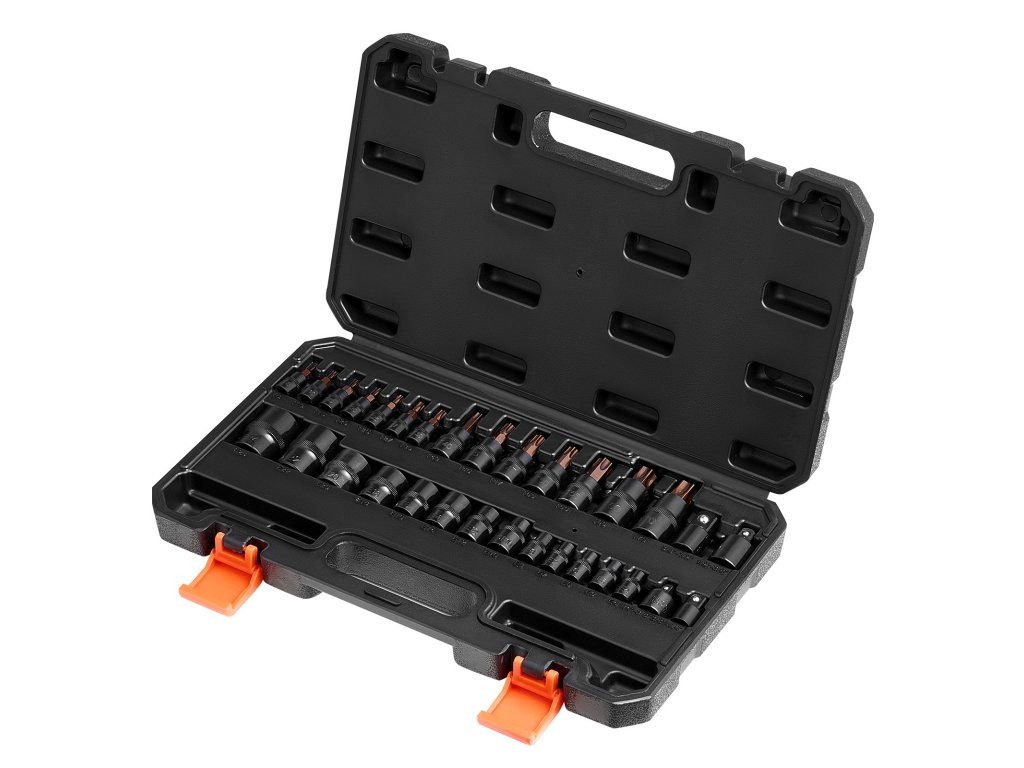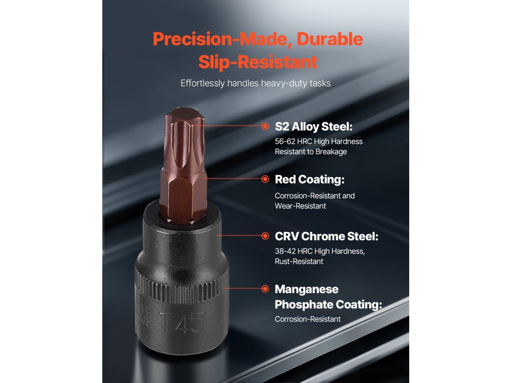 Setul de mufe Torx este fabricat din oțel aliat de înaltă rezistență și este proiectat să nu se rupă în timpul utilizării, reducând riscul de accidente în timpul reparațiilor. Finisajul biților, formulat pentru a rezista la coroziune, asigură o prindere fermă și previne alunecarea în timpul aplicațiilor cu cuplu mare.