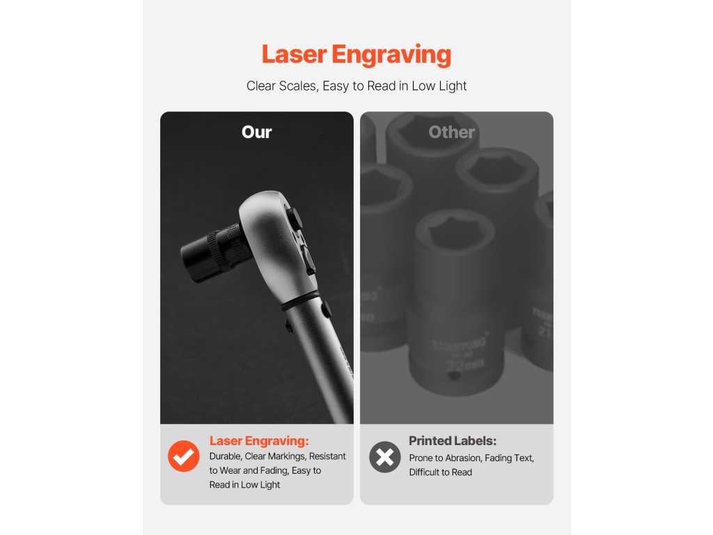 Designul cu margini teșite asigură o introducere lină, reducând uzura și prelungind durata de viață a setului de mufe Allen. Dimensionate cu precizie pentru a ține în siguranță diferite tipuri de șuruburi, marcajele rămân foarte vizibile chiar și în zone slab iluminate, permițând o identificare rapidă și ușoară.