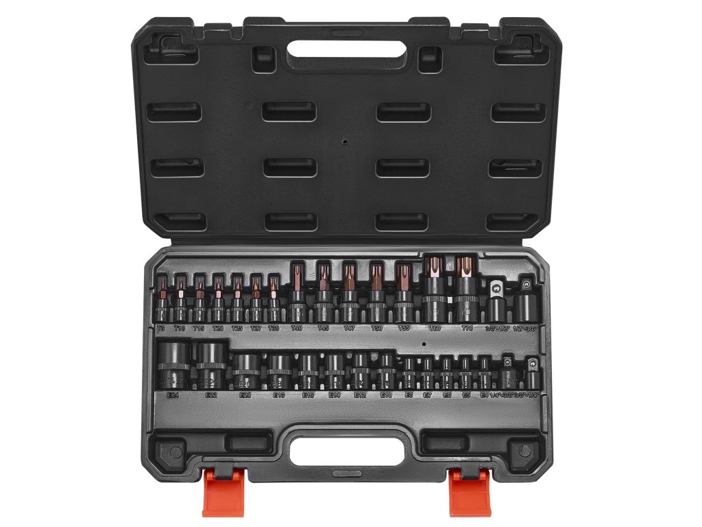 Set biți și chei tubulare Torx 31 bucăți T8–T70 și E4–E24, cu adaptor