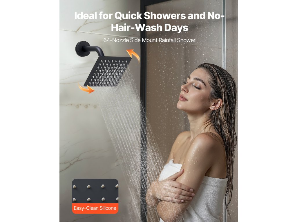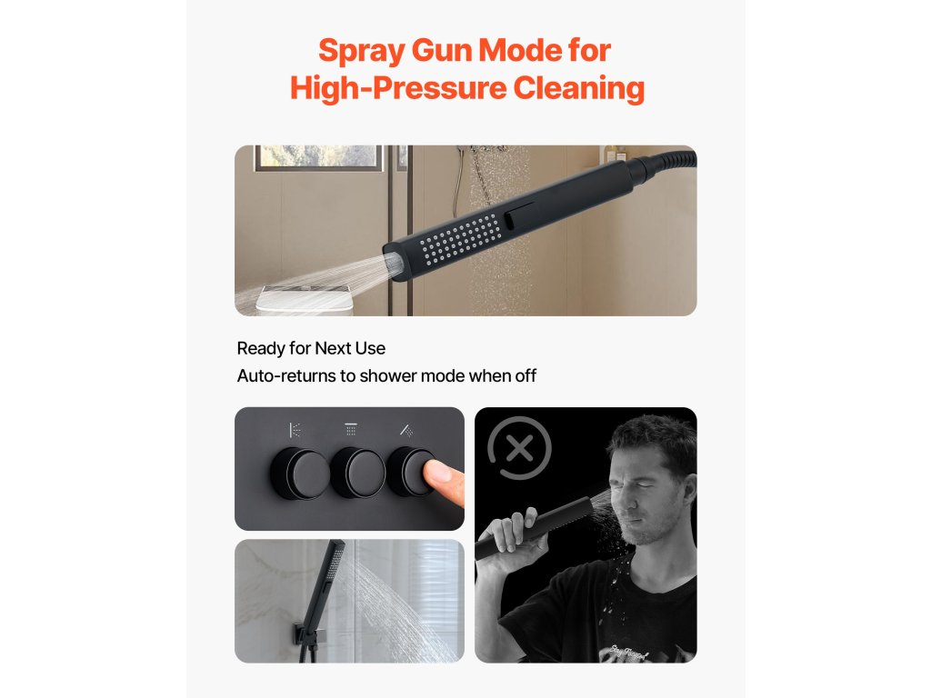 În acest sistem de duș cu ploaie, jetul de mână revine automat la modul duș după închidere, împiedicând pulverizarea accidentală data viitoare când este utilizat.