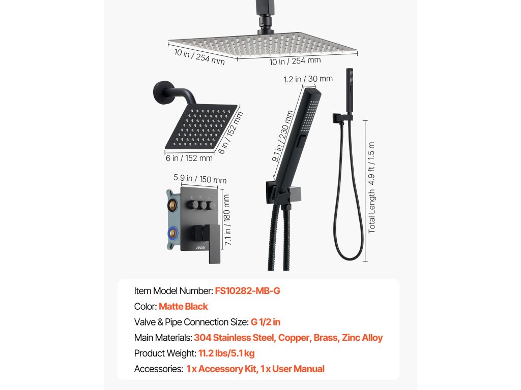 Set de duș 254 mm tavan, 152 mm perete, duș manual 2 în 1